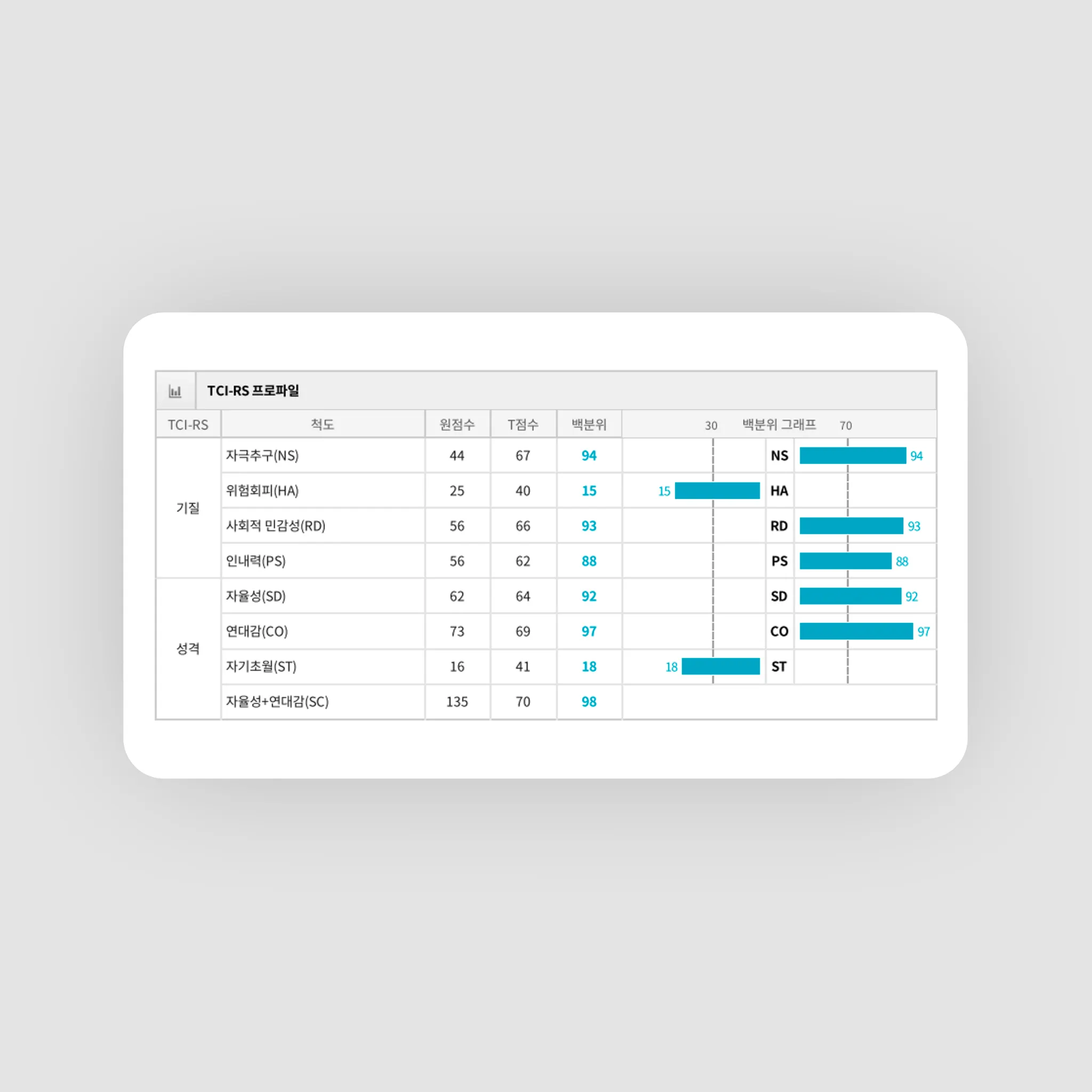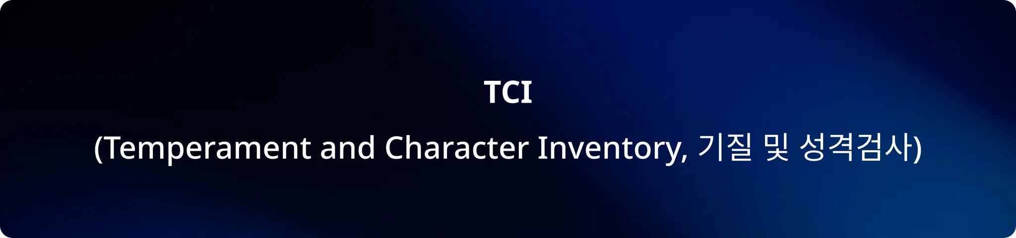 TCI 검사는 개인이 태어날 때부터 가지고 있는 기질과 성장하면서 형성해온 성격을 구분해 측정하여 개인을 이해하는 데에 목적을 둔 검사입니다.
