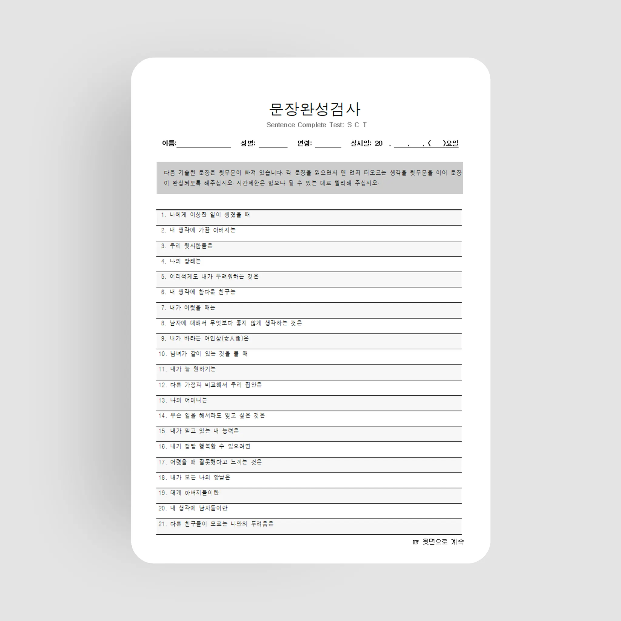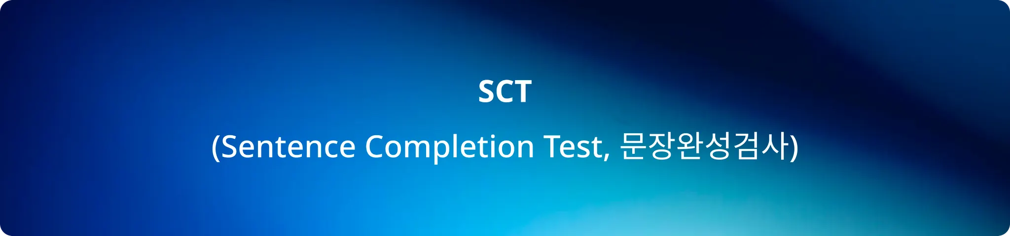 SCT 검사는 미완성의 문장에 적절한 말을 추가하여 완전한 문장을 만들게 하는 검사로, 사용한 단어를 보고 그 사람의 특성을 이해하는데 큰 도움이 됩니다.