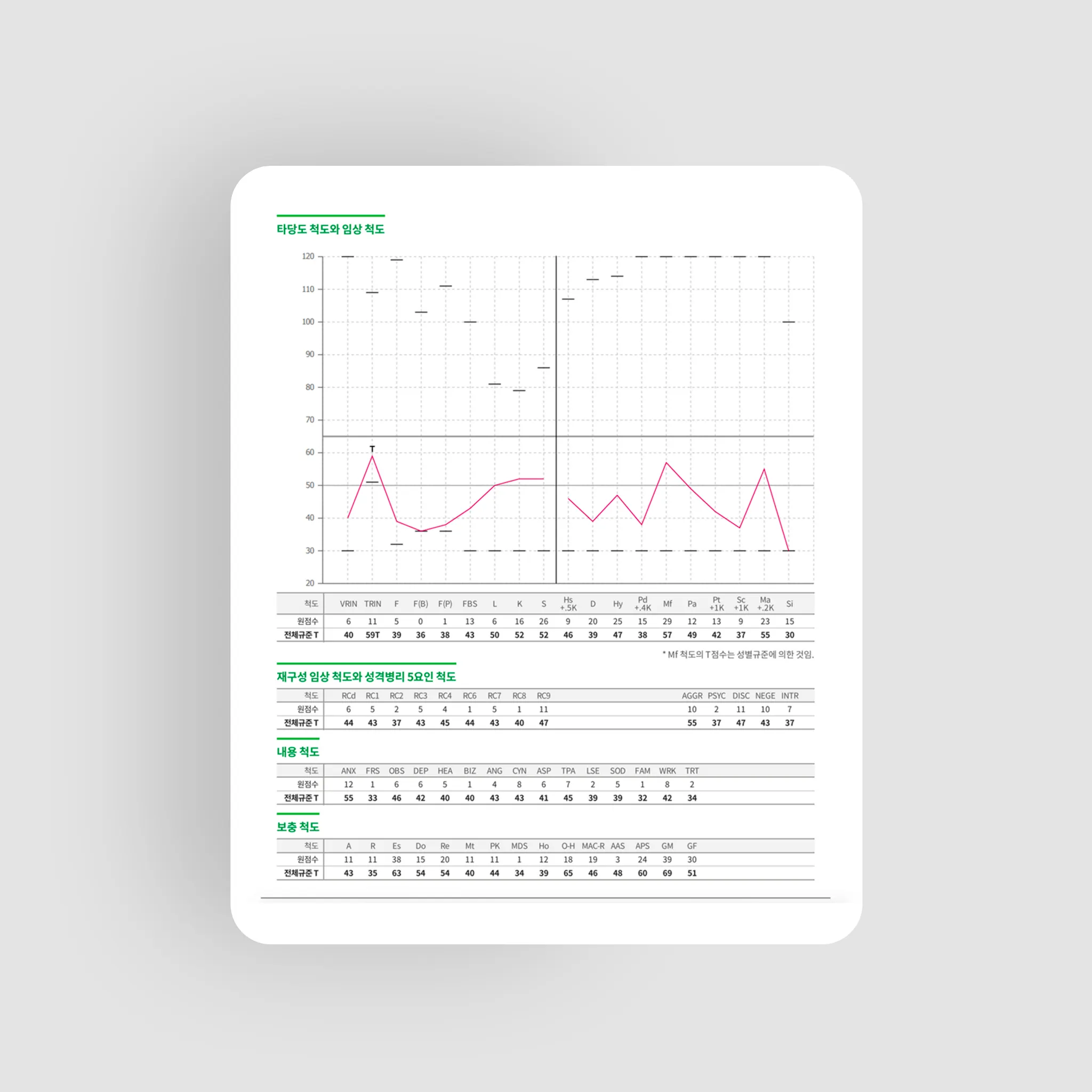우울증, 히스테리, 경조증, 반사회성, 남성(여성)특성, 편집증, 강박증, 정신분열증, 사회적 내향성 등의 10가지 척도를 평가하여 개인이 지니고 있는 심리적 특성의 정보인 성격, 정서, 그리고 적응 수준을 객관적으로 확인할 수 있습니다.