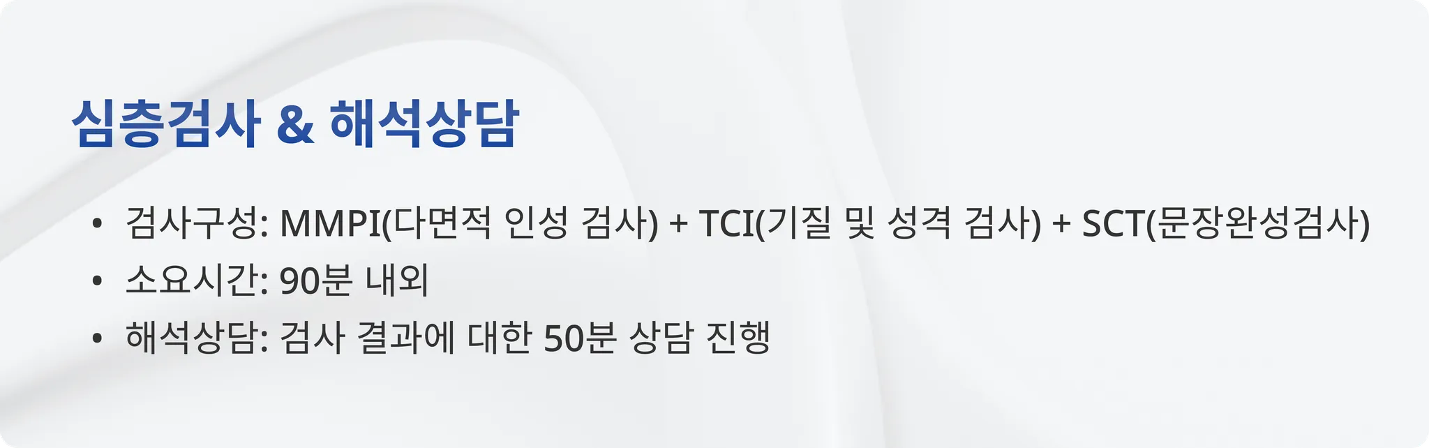 하지만 심층검사를 먼저 진행해 주시면 신청자 분의 현재 상태, 성격과 기질적 특성 등을 파악한 후에 상담을 진행할 수 있기 때문에 보다 구조화된 상담을 진행할 수 있습니다. 검사를 진행하지 않으시면 구조화를 하기까지 시간이 더 많이 소요돼요. 그럼에도 검사 문항이 많아서 부담스러우시다면, 우선 상담을 신청하셔서 받아보신 후, 상담사의 권유에 따라 검사를 진행해 보시는 것도 좋을 것 같습니다!